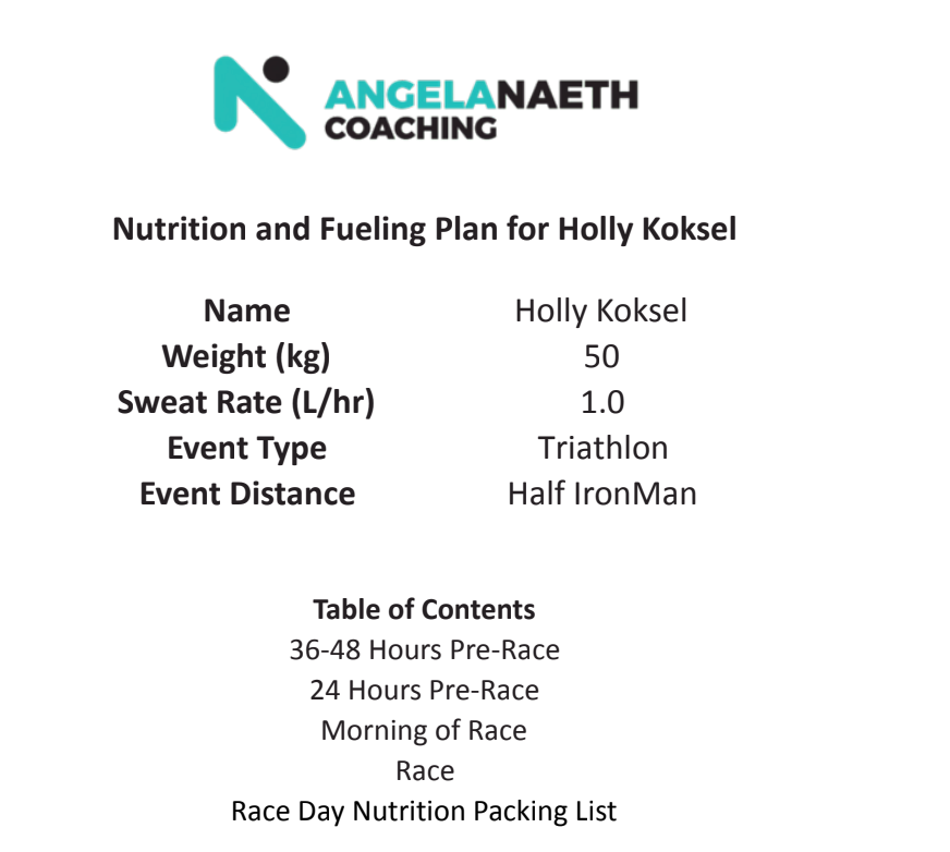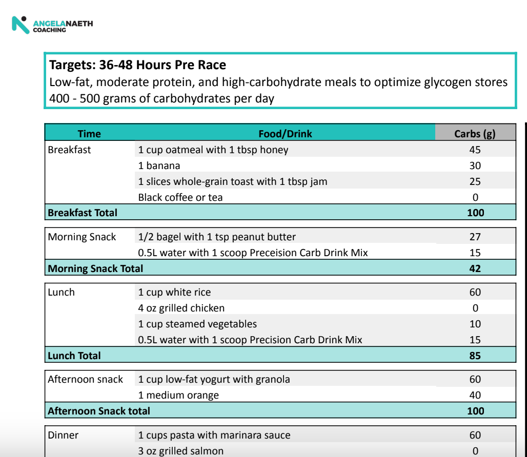 You’ll receive a PDF plan with step-by-step instructions for race week, pre-race, and race day fueling.